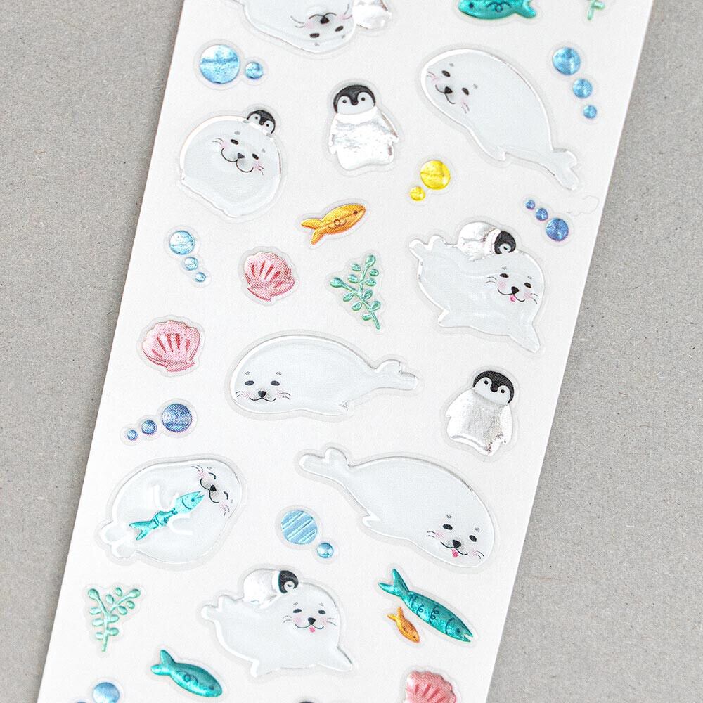まったりとしたアザラシと、仲良しの子ペンギンが可愛らしいシールです。