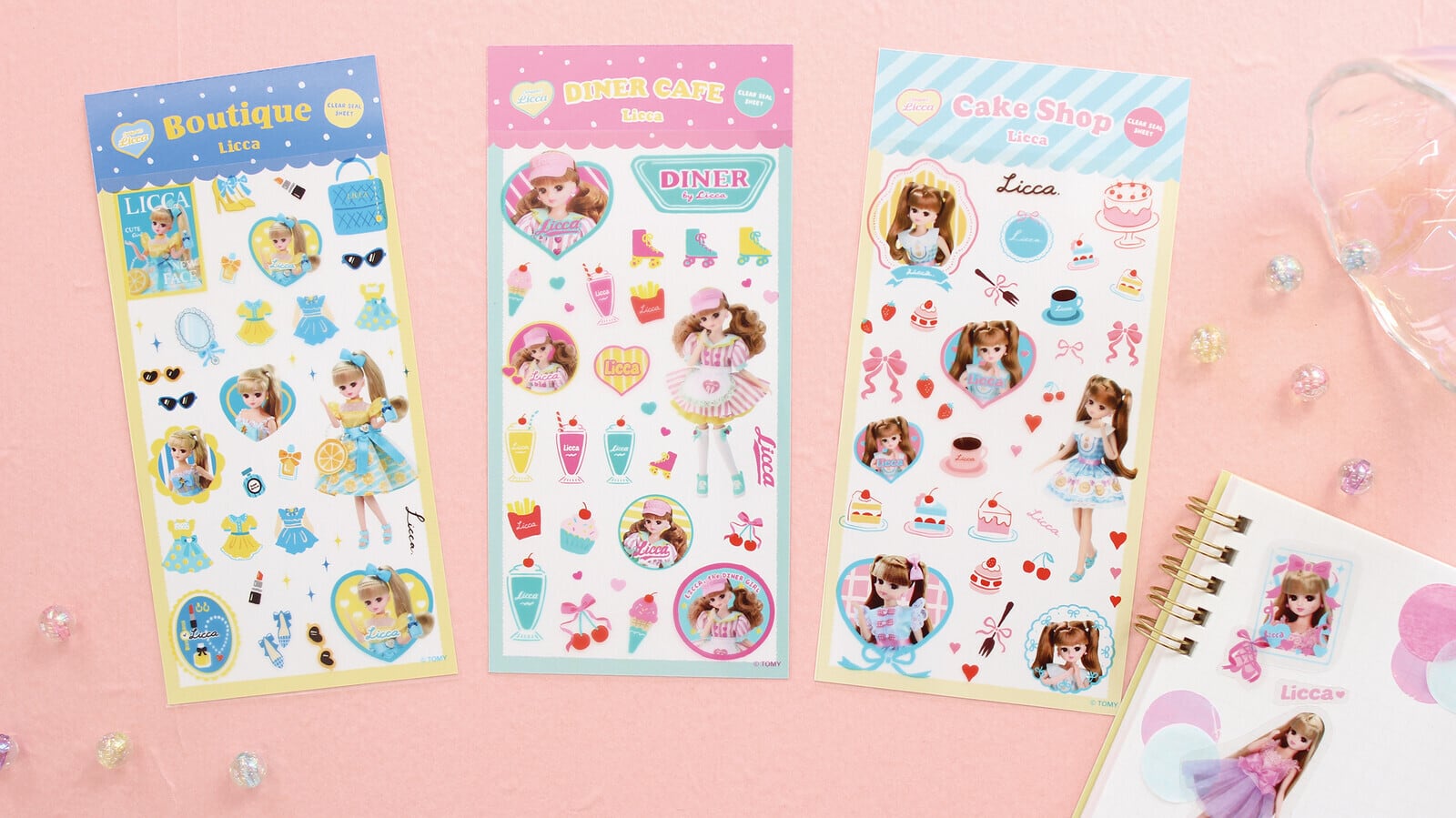 リカちゃんが憧れのおしごとで活躍する、小さめサイズの透明シールです。